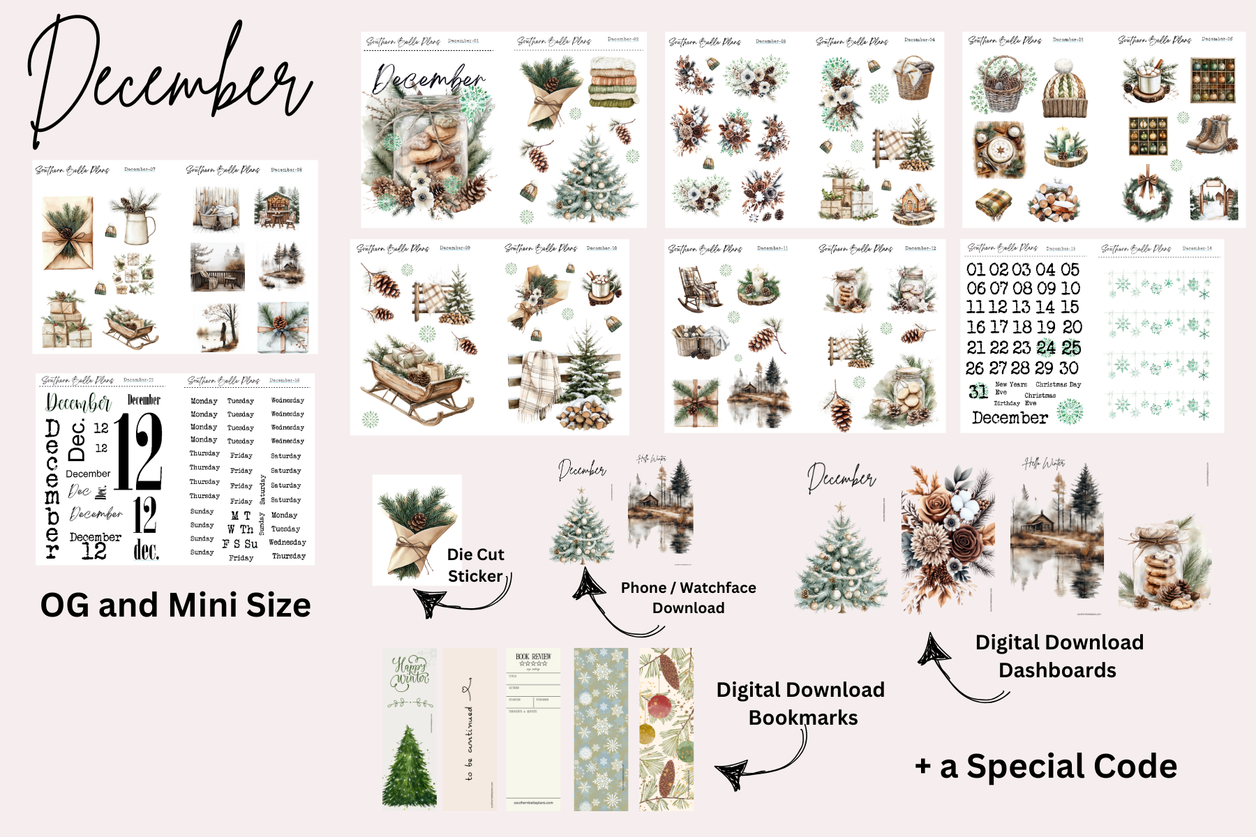 16 Transparent Sticker Sheets + 28 Digital Dashboards (4 designs in 7 sizes) + 1 Digital Download Phone Wallpaper / Watch Face + 1 Die cut Sticker + 5 Digital Download Bookmarks
